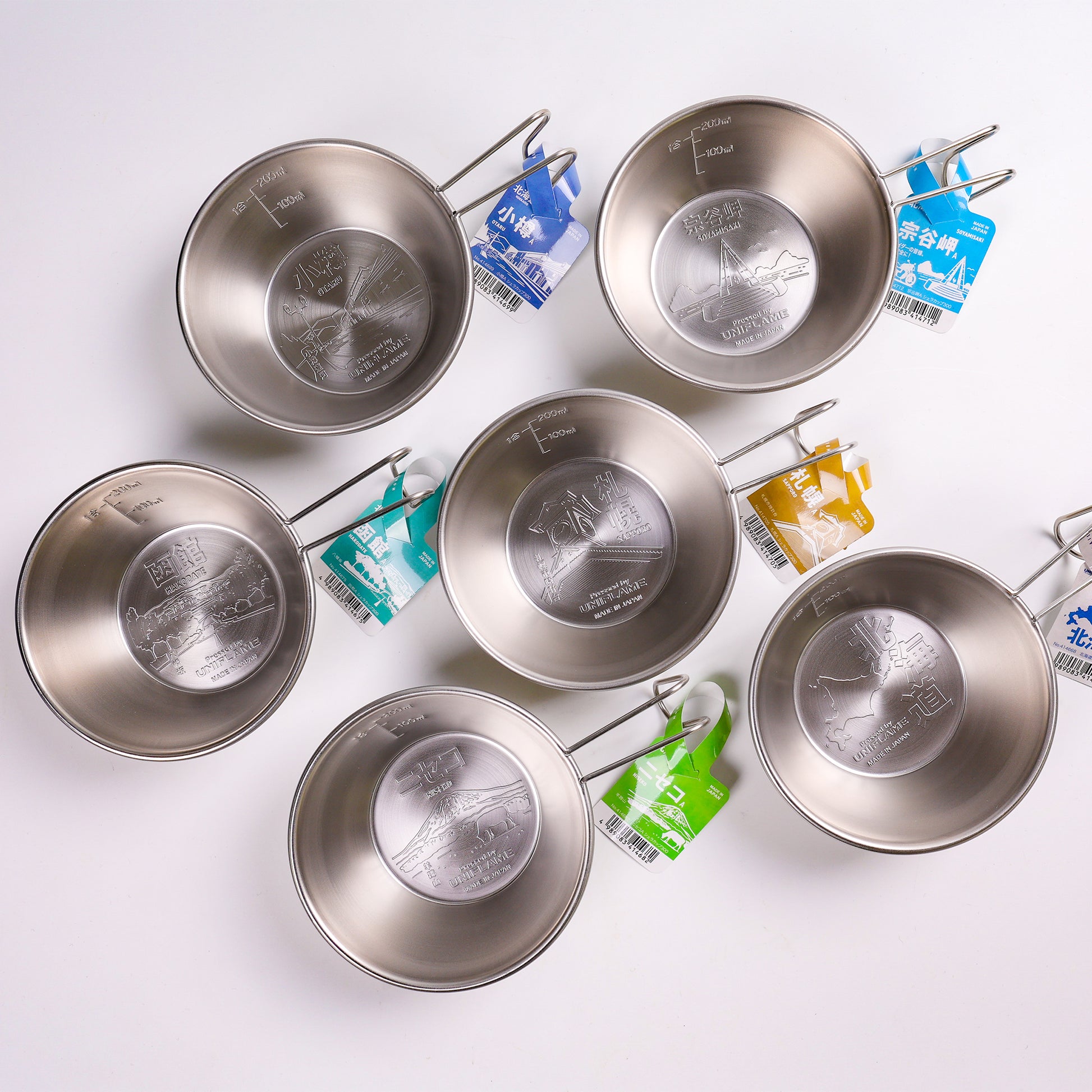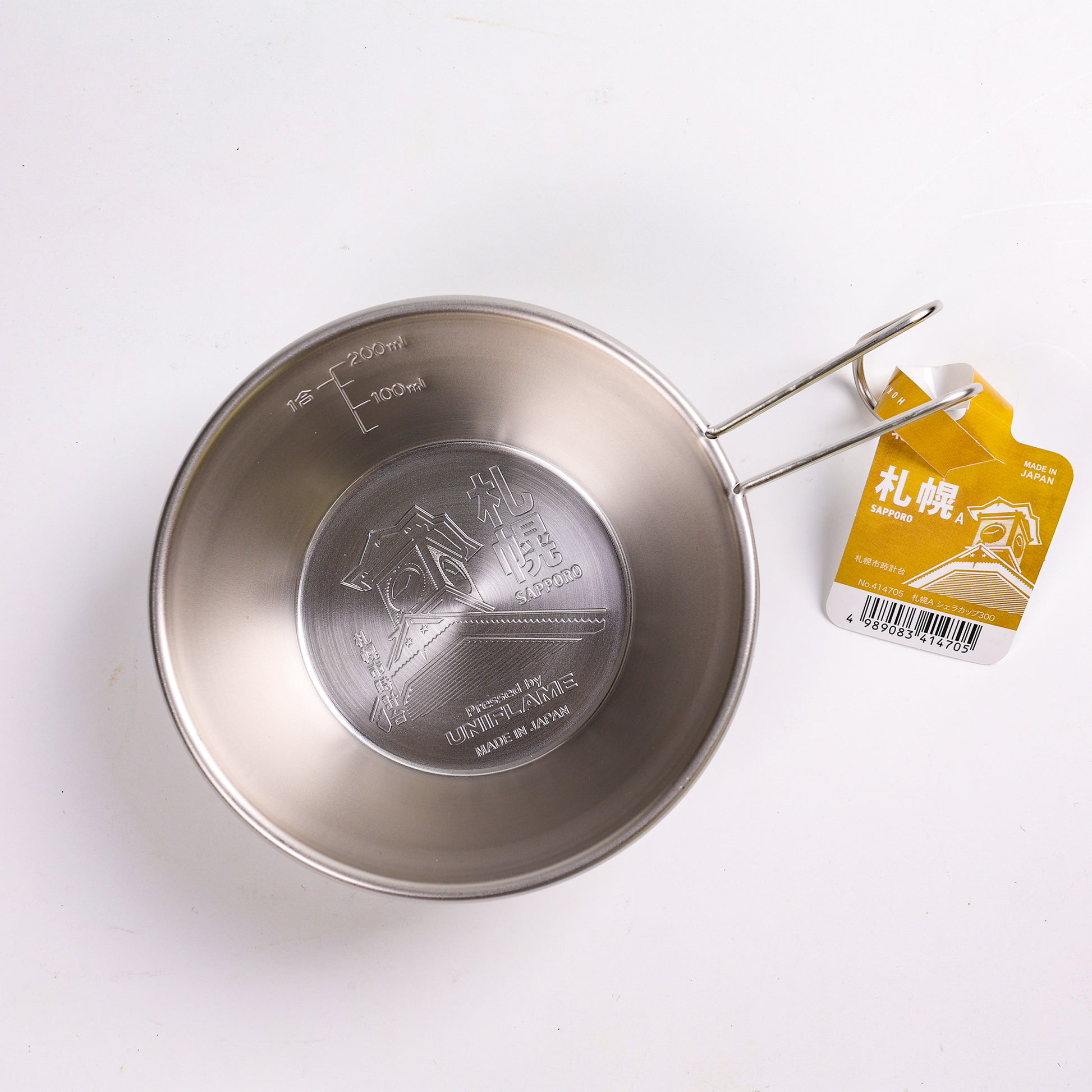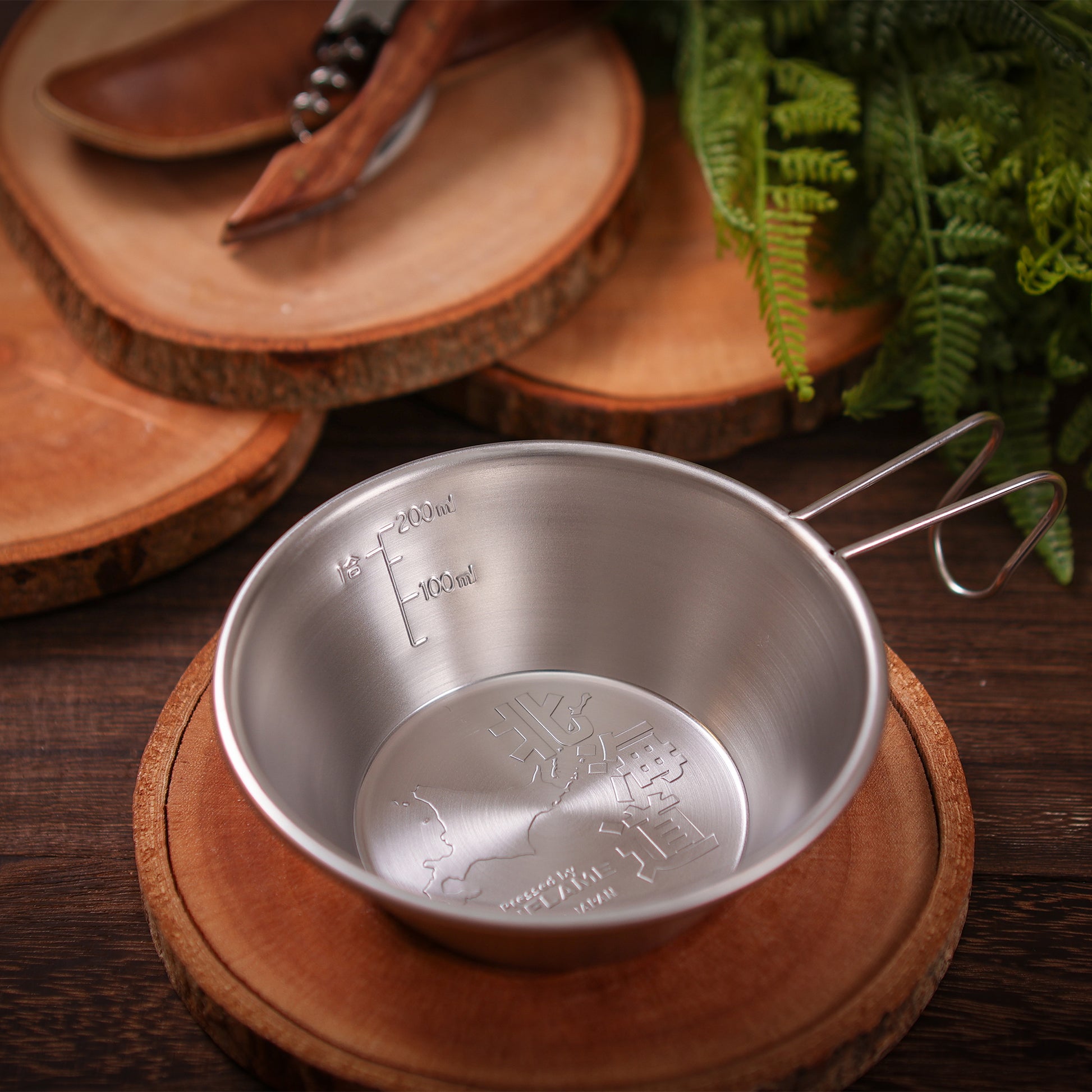 【札幌】 北海道限定シェラカップです。 収納性抜群!目盛付き、サビにくいステンレス製です 「シェラカップ」は金属製のカップの一種で、キャンプや登山などアウトドアの場での食器や調理器として、たくさんのアウトドアユーザーに愛用されています。 コーヒーカップとして、鍋として、計量カップとして…などなど。 アウトドアシーンで大活躍するシェラカップはコレクターズアイテムとしても人気です。